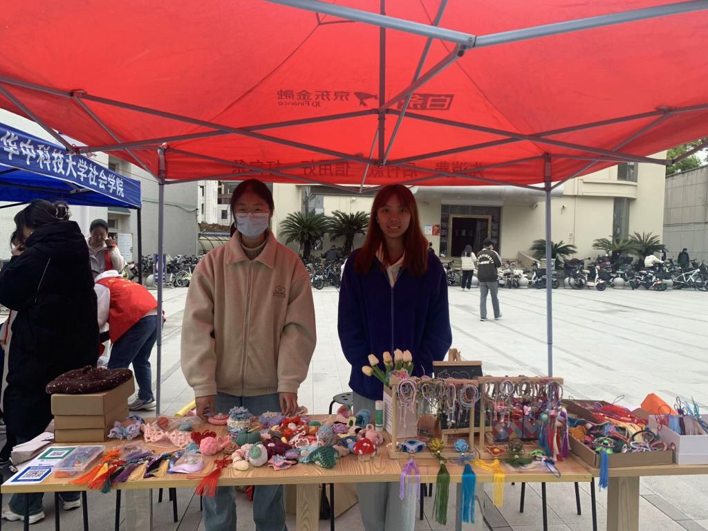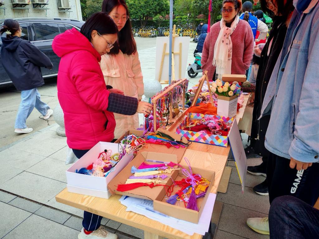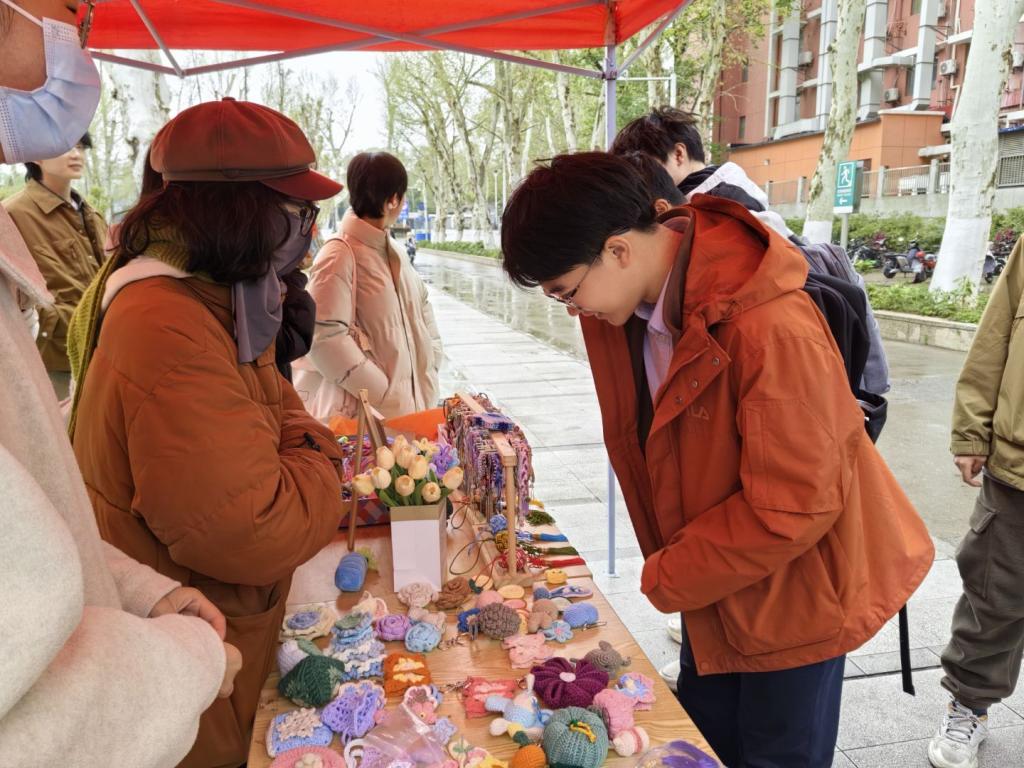 3月29日,四院资委会成员于紫菘学生公寓广场路口携手举办“巧手筑梦”雷锋月义卖活动。义卖活动现场,前期由志愿者义工制作的针织玩偶、中国结、编织手链等200余件手工艺品整齐陈列。志愿者们热情地向驻足师生介绍:“这个中国结采用了传统编织技法,寓意吉祥如意” “这些毛线玩偶内部填充的是草木香料”。在义卖过程中也向同学们讲解中国传统编织技术与文化底蕴。