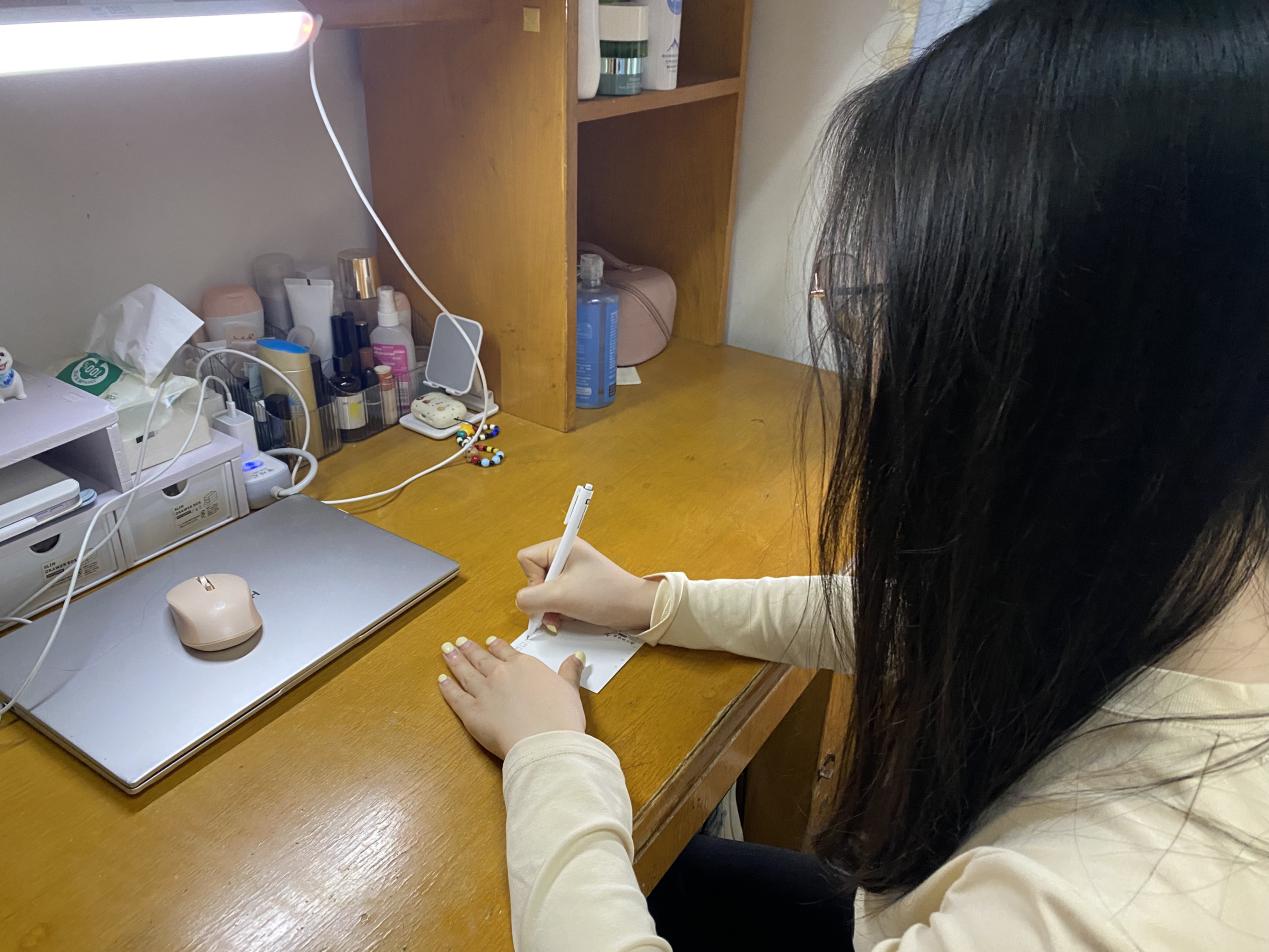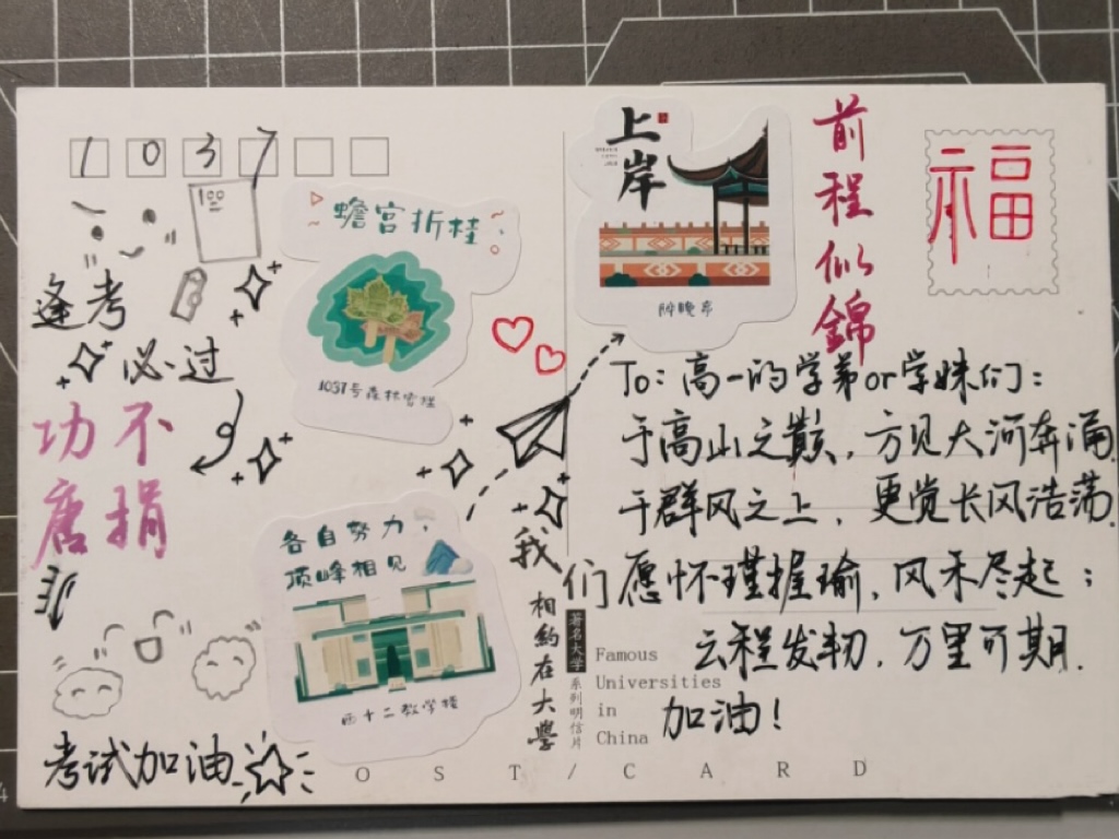 “弟弟妹妹们考试加油!”“祝你们升学顺利!”4月20日,公共管理学院、土木与水利工程学院、电气与电子工程学院、能源与动力学院资委会成员与“巧手筑梦”活动义工,共同为受助的临翔区第一中学、隆安县第一小学的孩子们书写祝福寄语。作为手工创作与公益义卖活动的组织者与深度参与者,他们在物质帮扶外,成为山区孩子们远方的朋友,以明信片为载体,解答孩子们在学习和成长过程中的迷茫与困惑,用一句句真挚的表达、一声声温暖的鼓励陪伴孩子们成长。
