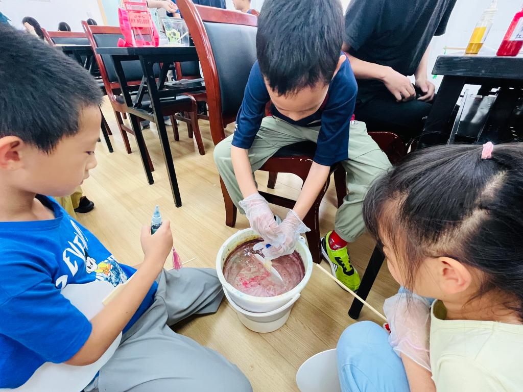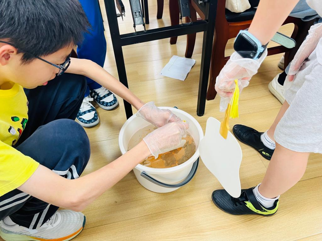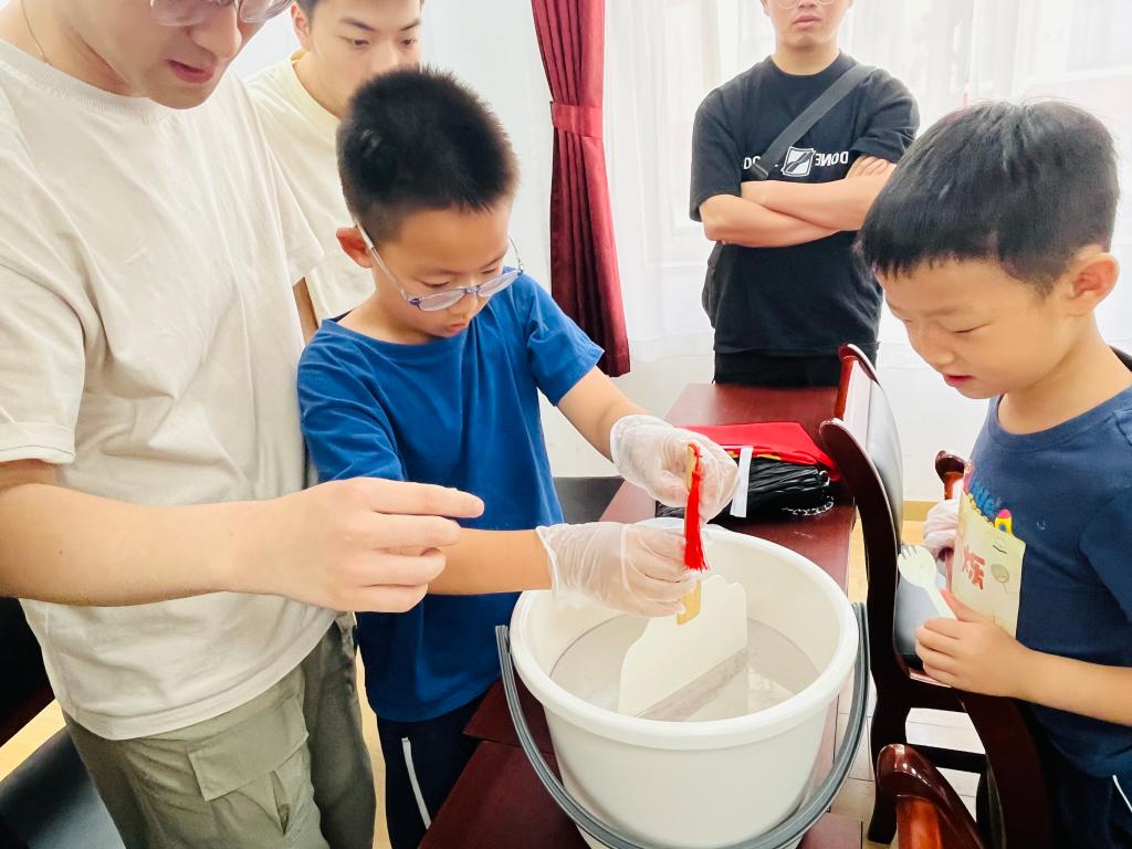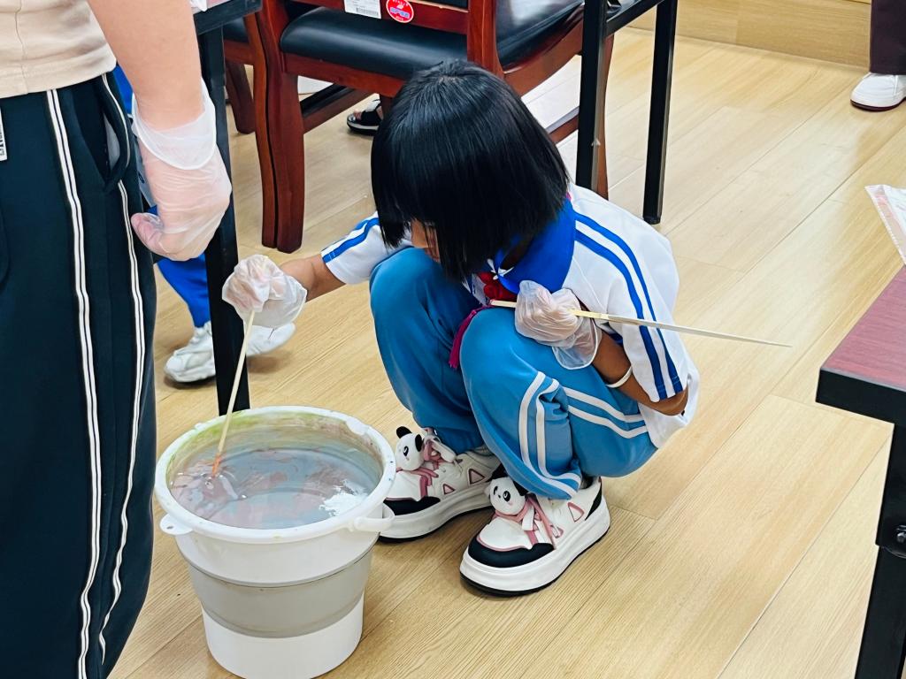 漆扇制作环节,志愿者向孩子们分步演示制作流程并悉心指导。孩子们纷纷化身“非遗小匠人”,调漆、滴彩、搅动水面形成纹路,再慢慢将扇面浸入水中,一把把充满童趣的漆扇逐渐成型。看着自己的作品,孩子们脸上洋溢着自豪的笑容,纷纷举起扇子向同伴展示自己的童“画”世界。