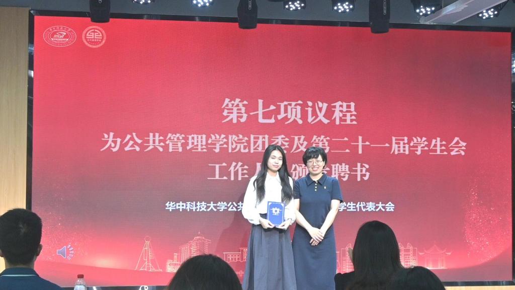 粟晓丽、孙海洋、何磊分别为第二十一届学生会工作人员和上一学年本科生团委兼职干部颁发聘书,感谢他们的辛勤付出。
