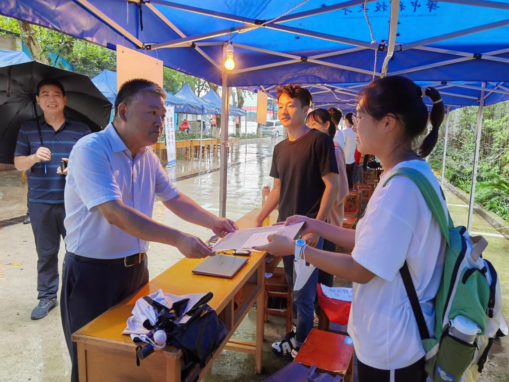 18日上午9:30左右,学院党委书记马冬卉老师、副书记童文胜教授也来到现场了解迎新进展情况。看到迎新现场有许多已完成报到的新生前来主动担任迎新志愿者,他们给予了高度肯定与赞赏。看到新生熊映萱同学穿着单薄,马书记还亲切提醒她最近降温,要注意保暖。
