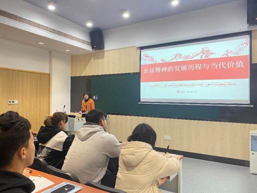 在讲述过程中,马冬卉老师带领同学们学习历届国家领导人在纪念长征胜利周年纪念大会上的讲话,引导大家从公共管理学科视角思考长征精神在不同的时代背景下的崭新诠释和鲜活生机,并指出发扬长征精神与实现中华民族伟大复兴的中国梦始终联系紧密、同向同行。