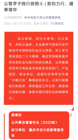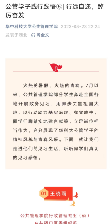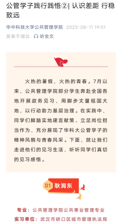 “喻见硚口·共赢未来”优秀大学生实习实践活动为“遇见武汉”实习实践工作之一。2023年暑假,学院28名研究生和本科生分别前往硚口区党政机关、企事业单位的一线,开展了为期1个月的政务实习实践。