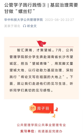 2023年,学院将专业特色与社会实践进行紧密融合,于武汉市硚口区委组织部和长沙市望城区团委揭牌社会实践基地,派出60余名学生骨干开展政务见习。