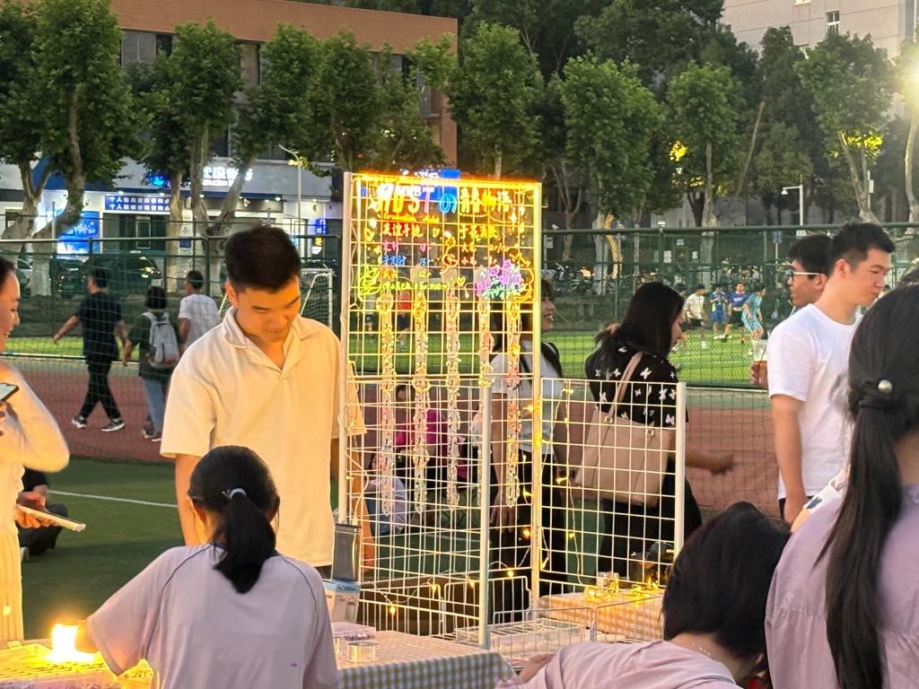夜幕降临,市集灯光陆续亮起,吸引了大量师生参与。
