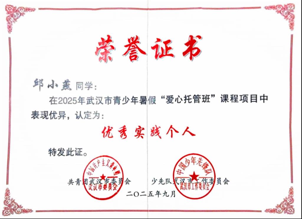 近日,2025年武汉市青少年暑假“爱心托管班”项目评选结果公布,公共管理学院“公行至善”志愿服务队表现突出,荣获多项市级荣誉。团队获评“优秀实践团队”,何磊老师被授予“优秀指导老师”称号,行管2301班王慧、邱小燕同学获评“优秀实践个人”,充分展现了公管师生扎实的实践能力与昂扬的青春风貌。