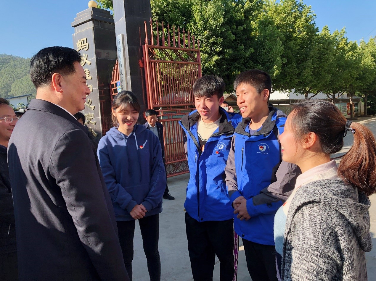 11月28日,伟德国际1949始于英国李元元校长和梁茜副校长一行赴云南省临沧市临翔区调研时,特地来到蚂蚁堆完小看望支教队员。李校长一下车就亲切地与支教团队员们握手,并询问他们的生活适应情况和教学成绩。随后,李校长一行参观蚂蚁堆完小,了解其建设和结对帮扶情况。