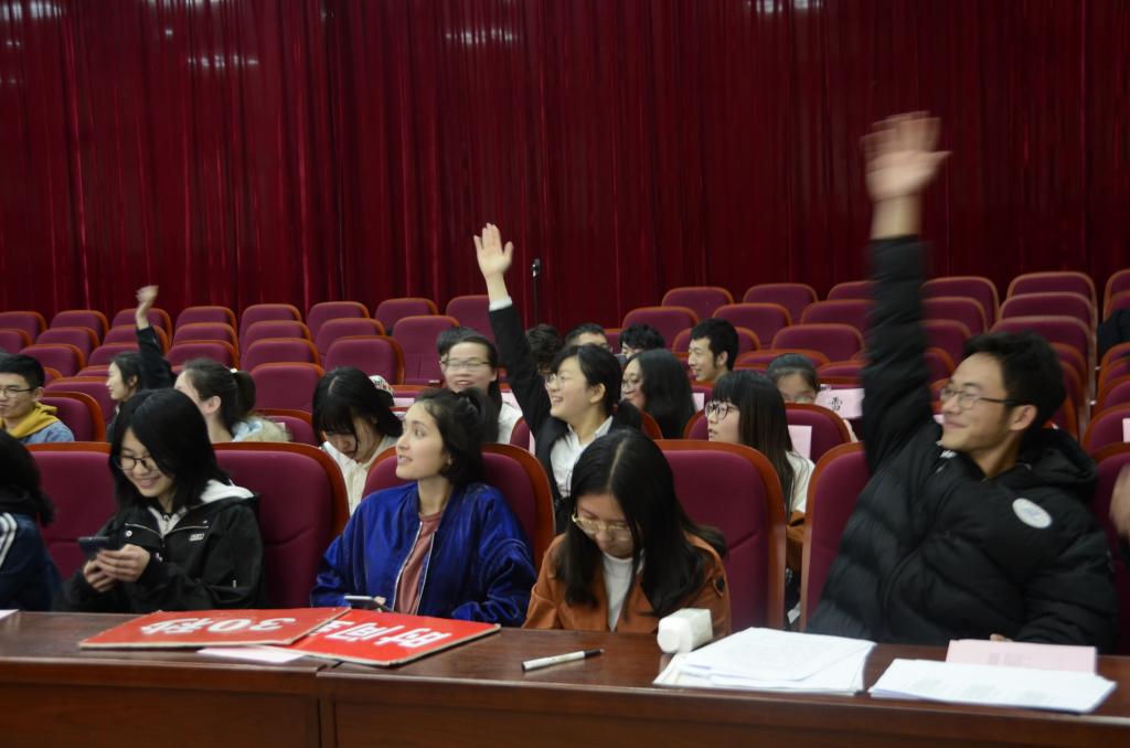 主题演讲结束的中场休息环节,是安排的两会小知识竞答,同学分踊跃抢答,让大赛紧张的气氛得到了一些释放。