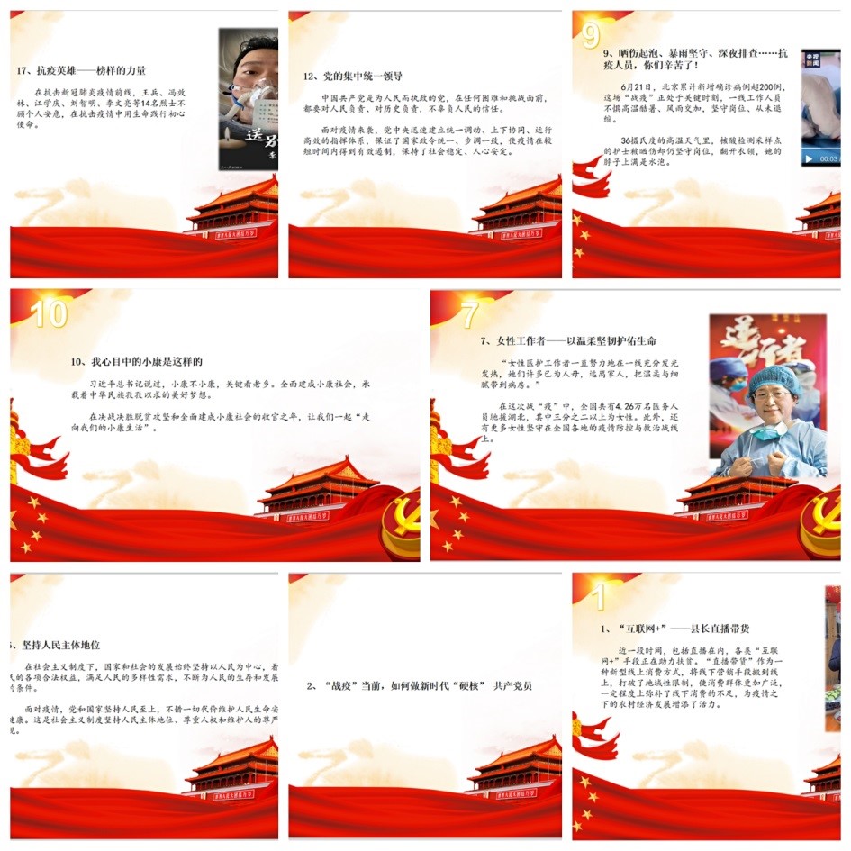 来自硕士1902党支部的李悦萧同学着眼于精准扶贫背景下乡村旅游的机制构建,根据实地调研,构建了四位一体助力旅游扶贫机制,并取得了良好效果。真正做到学以致用,体现出共产党员的实干精神。第七组是来自硕士1802党支部的谭纪焕同学,带我们回顾了新冠疫情与党中央和全国人民的抗疫故事。来自硕士1903党支部的李春艳同学,以共产党员的“特权”为切点,阐释了新时期的共产党员的“特权”在于使命与担当,在于责任感与使命感并存。