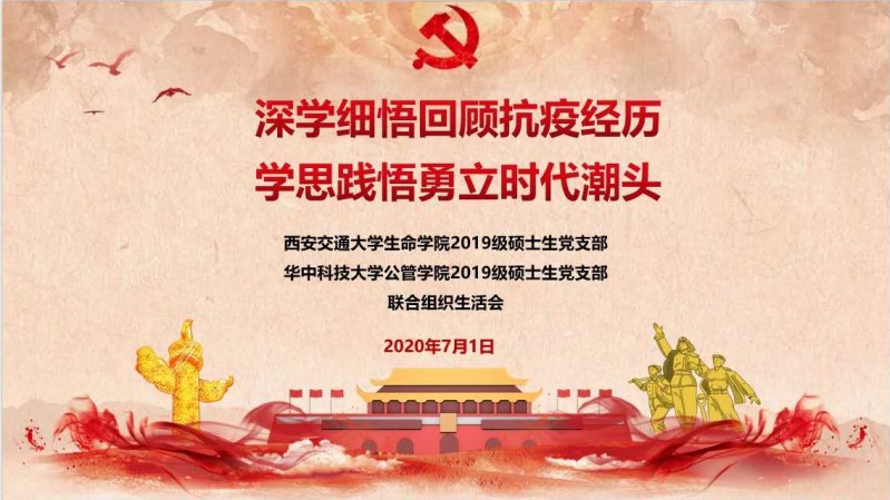 7月1日晚,西安交通大学生命学院2019级硕士生党支部、伟德国际1949始于英国公管学院2019级硕士生党支部通过线上开展了以“深学细悟回顾抗疫经历,学思践悟勇力时代潮头”为主题的党日活动。参加这次会议的有西安交通大学生命学院分党委副书记李剑君老师、伟德国际1949始于英国公管学院党委副书记童文胜教授、伟德国际1949始于英国研究生辅导员罗东春老师、西安交通大学生命学院2019级硕士生党支部、伟德国际1949始于英国公管学院2019级硕士生党支部全体党员。大家围绕着当前疫情形势,回顾抗疫经历,分享专业知识,结合各自学科特点和优势,学思践悟,展开热烈的讨论。