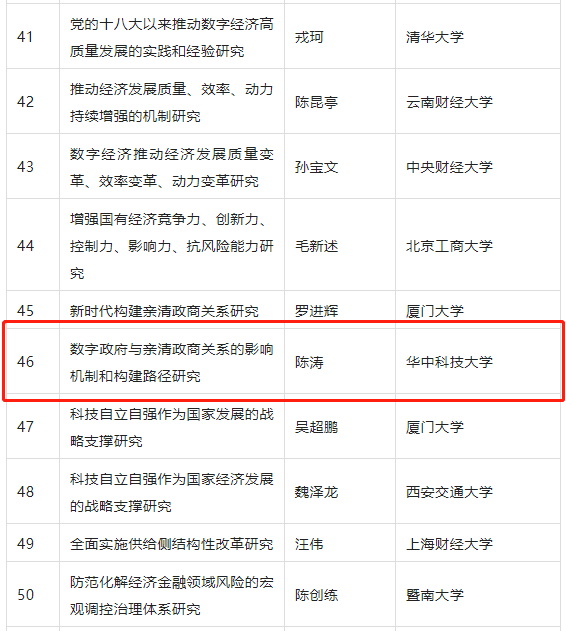 近日,全国哲学社会科学工作办公室公布了研究阐释党的十九届六中全会精神国家社科基金重大项目立项名单,共有130个课题批准立项。伟德国际1949始于英国3个课题获批立项,立项数位居全国高校并列第四,其中我院陈涛教授的《数字政府与亲清政商关系:影响机制和构建路径研究》课题获批立项。