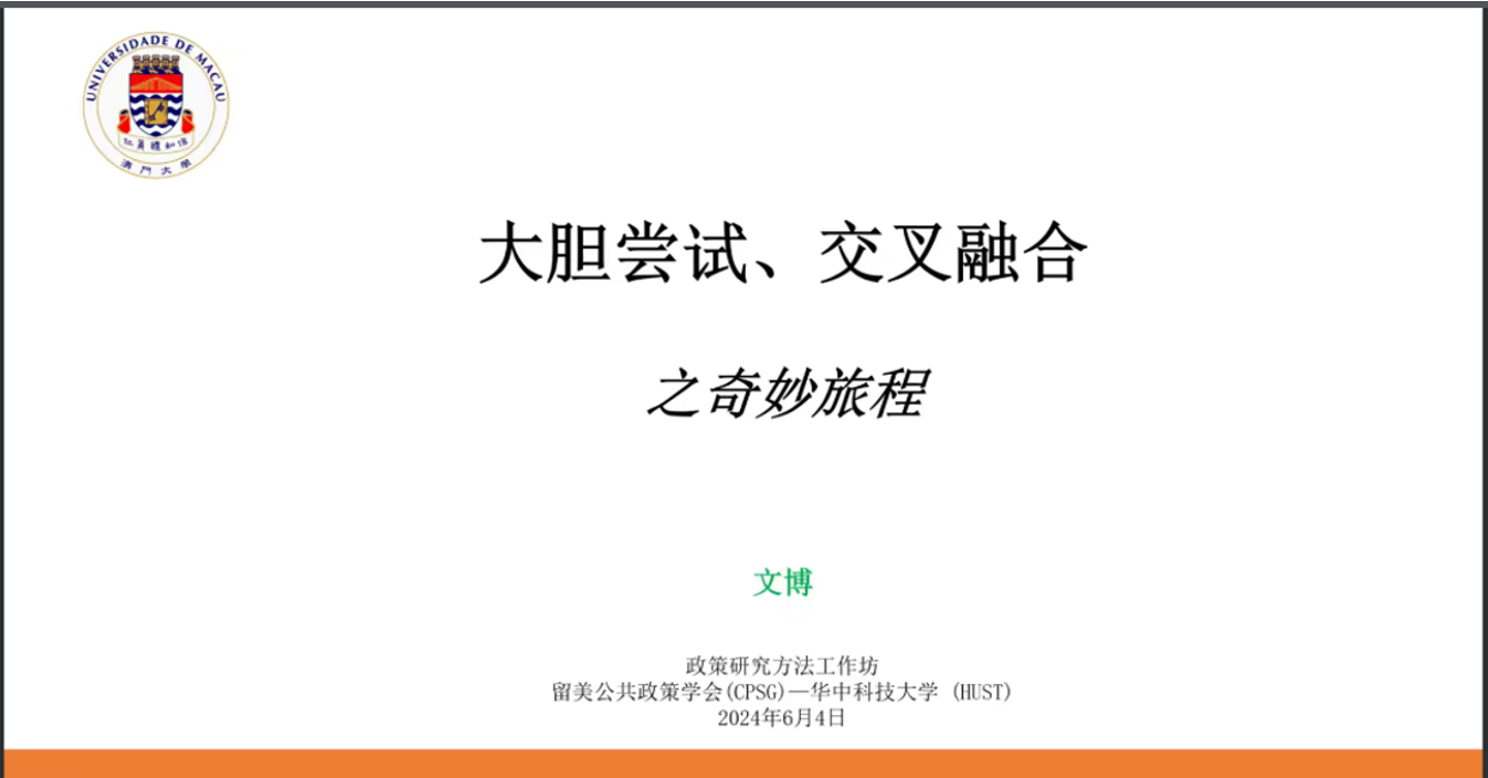 6月4日下午,澳门大学社会科学学院政府与行政学系副教授文博应邀在“留美公共政策学会(CPSG)—伟德国际1949始于英国(HUST)政策研究方法工作坊2024”系列活动中作题为“大胆尝试、交叉融合之奇妙旅程”的线上学术讲座。