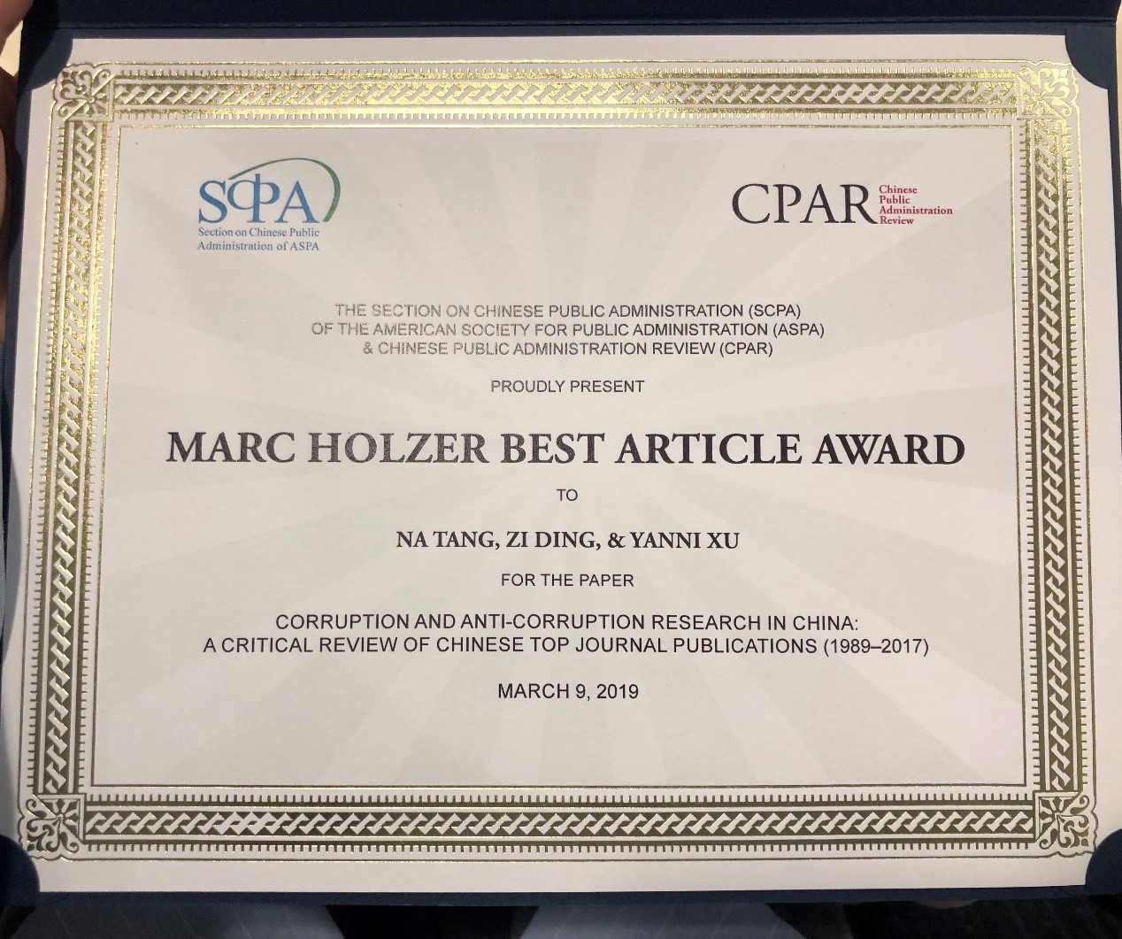 此外,由中国公共行政分会(SCPA)与Chinese Public Administration Review(CPAR)共同评选的年度最佳论文由我院青年教师唐娜及其合作者获得,他们的论文是Na Tang, Zi Ding, Yanni Xu: Corruption and Anti-Corruption Research in China: A Critical Review of Chinese Top Journal Publications (1989–2017),http://dx.doi.org/10.22140/cpar.v9i2.167。CPAR是美国公共行政学会(ASPA)中国公共行政分会(SCPA)的官方学术期刊,今年的最佳论文奖是由期刊编委会代表及特邀评审专家在2018年CPAR发表的所有学术论文中严格评选而来,获奖者在Section on Chinese Public Administration的会议上被授予Marc Holzer Best Article Award。