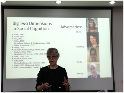 在讲座过程中,Fiske教授首先介绍到社会互动过程中存在大量的积极偏差,这种积极偏差在自我呈现、面对矛盾目标以及进行社会评价时尤为突出。Fiske教授详细讲解了她和同事于2002年提出的刻板印象内容模型(Stereotype Content Model),该模型认为人们会从热情(warmth)和能力(competence)两个维度对包括个体、群体及其他客体目标他人进行认知和评价。该模型是当前社会心理学研究中最广为人知和最受认可的理论模型之一,具有极强的学术影响力,越来越多的社会学、经济学和管理学研究者运用该模型从事社会科学研究。Fiske教授从事的大量研究发现,在描述个体或者群体印象时,人们往往会选择性的忽略消极信息,只保留积极信息,而这种倾向致使刻板印象内容难以变动。另外一方面,人们也会根据这种倾向来对形成对他人的印象或者进行自我印象管理。在不同的社会地位人群之间的互动更是如此,高社会地位的人在交流过程中,往往喜欢让自己表现得更热情,而低社会地位的人在交流过程中则努力希望让自己表现得具有更高能力。