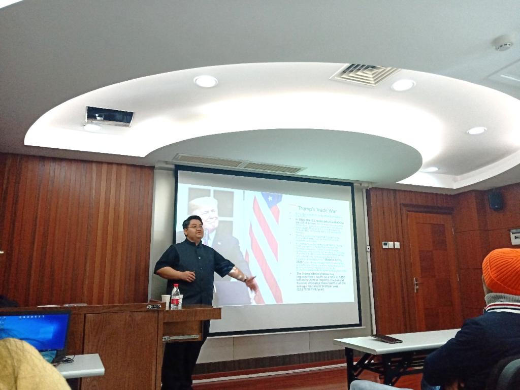 28日上午10:00-12:00,Piti Srisangnam教授以“Trade War:The End of American World Order and The Rise of China”为主题开展讲座,教授结合大量数据与案例,将4次工业革命与国家间的贸易关系与贸易地位联系起来,从历史的视角分析了贸易战。报告吸引了来自不同年级、不同国家的学生参加,与会师生展开了热烈的学术讨论。