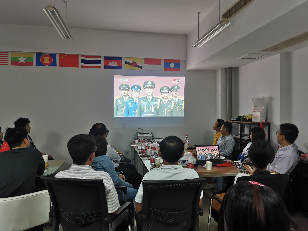 上午十点整,随着礼炮声响起,阅兵式开始。东盟研究中心办公室内,一个个面孔面向屏幕,大家聚精会神地观看,共同感受新中国七十年华诞的热烈气氛。随着阅兵中一个个方队的出场,观看现场一次次进入高潮,师生们用他们热烈的掌声和满怀豪情的赞叹声表达着对中国发展的惊叹。