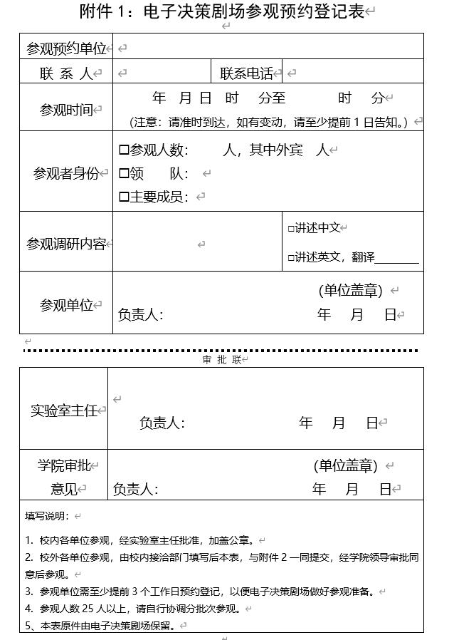 1.填写“ 电子决策剧场参观预约表”(附件1:电子决策剧场参观预约表),至少提前2个工作日以邮件或书面形式提交至剧场管理员,邮箱:781496434@qq.com。