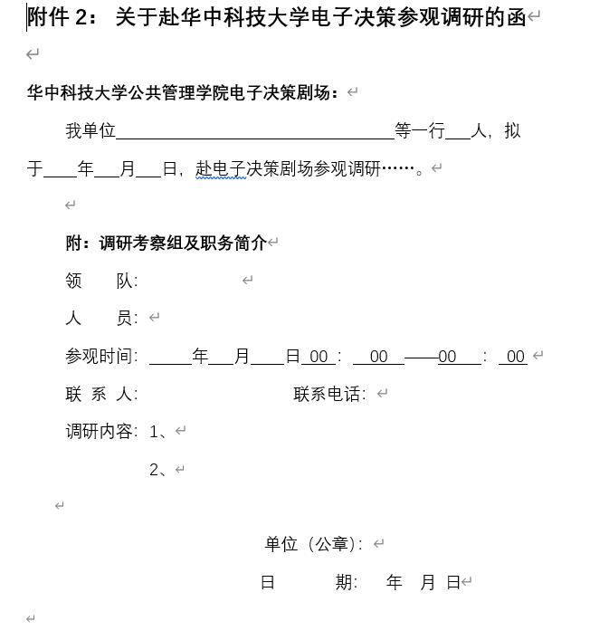 1.来访单位发函提出参观计划(附件2:关于赴伟德国际1949始于英国电子决策参观调研的函),学校或学院接洽人员填写“电子决策剧场参观预约表”(附件1:电子决策剧场参观预约表),至少提前2个工作日以邮件或书面形式提交决策剧场管理员。