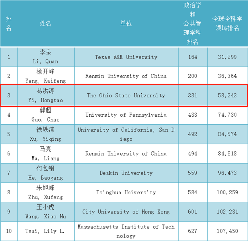 近日,斯坦福大学John P.A. loannidis和Elsevier团队研究人员发布了涵盖全球各个学科、近19万名顶尖科学家论文引用量的数据库,并对其终生影响力和2020年学术影响力进行排名。以政治学和公共管理学为主要领域的2020年全球政治学与公共管理学华人顶尖学者影响力排名中,共十位华人顶尖学者上榜,其中我院院友易洪涛位列第三。