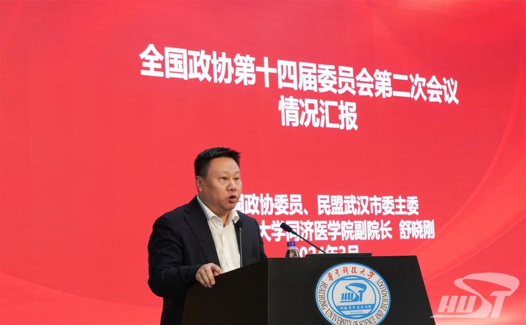 全国政协委员,民盟中央委员、省委会副主委、市委会主委,同济医学院副院长、主任医师舒晓刚从基本情况、重要精神和取得成果等方面解读了十四届全国人大二次会议精神,并汇报了“关于尽早规划和培育我国生物智造产业的提案”“关于实施国家教育数字化战略,引领世界数字教育新赛道的提案”等内容。他表示要坚定历史自觉,坚持家国情怀、务实作风、专业态度,把实干、责任、担当书写在推进中国式现代化新征程上,无愧于新时代政协委员的使命与担当。