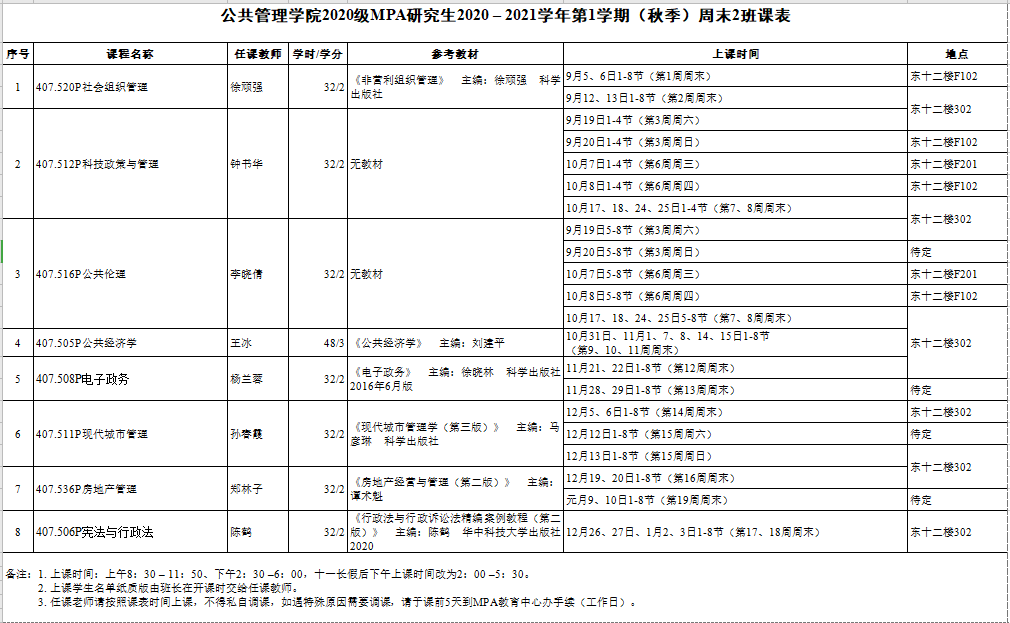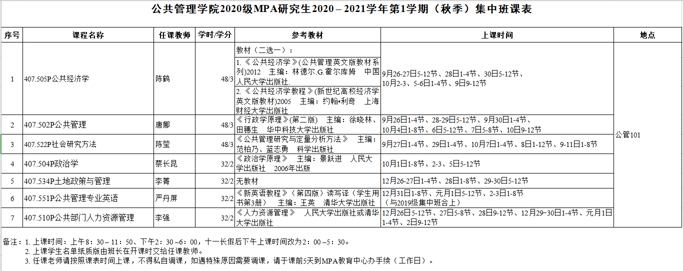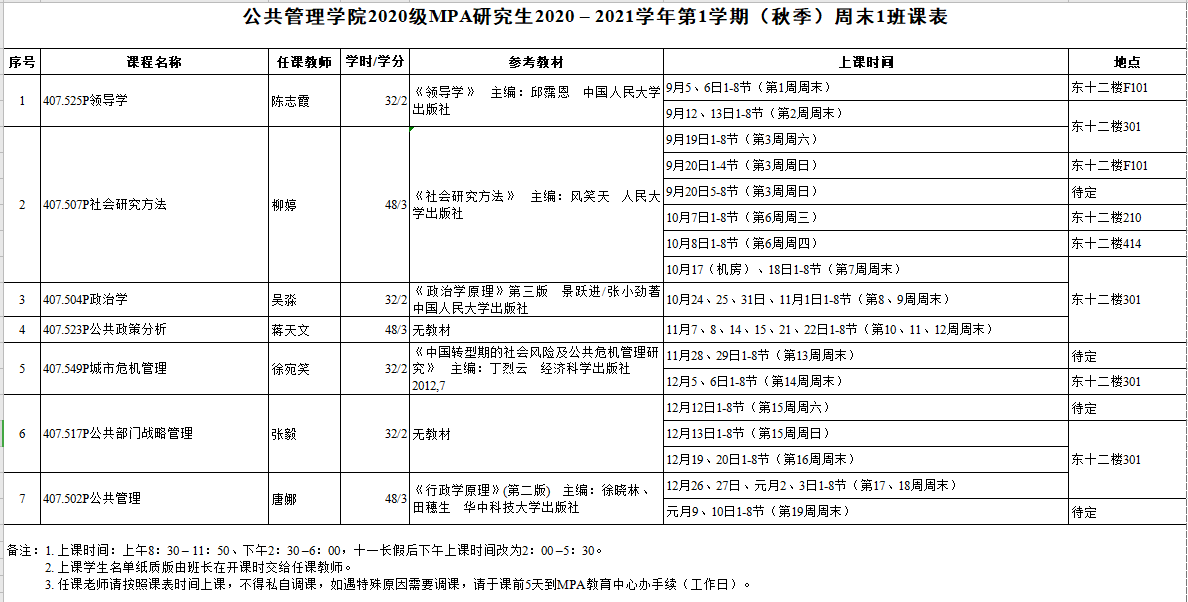 公共管理学院MPA研究生2020 – 2021学年第1学期(秋季)课表