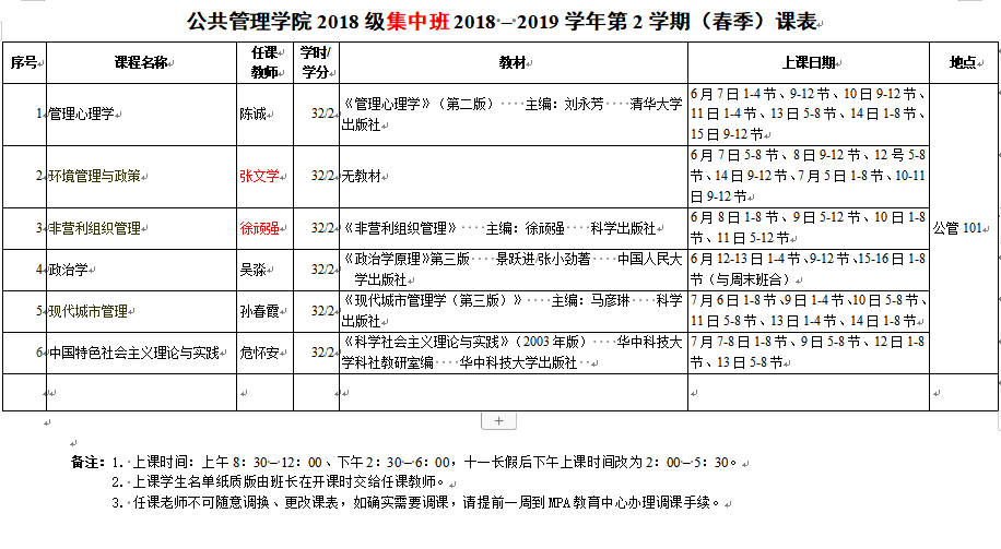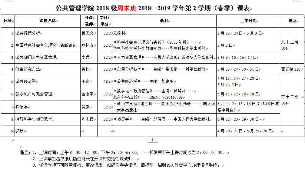 公共管理学院2018级MPA研究生2018-2019学年第2学期(春季)课表