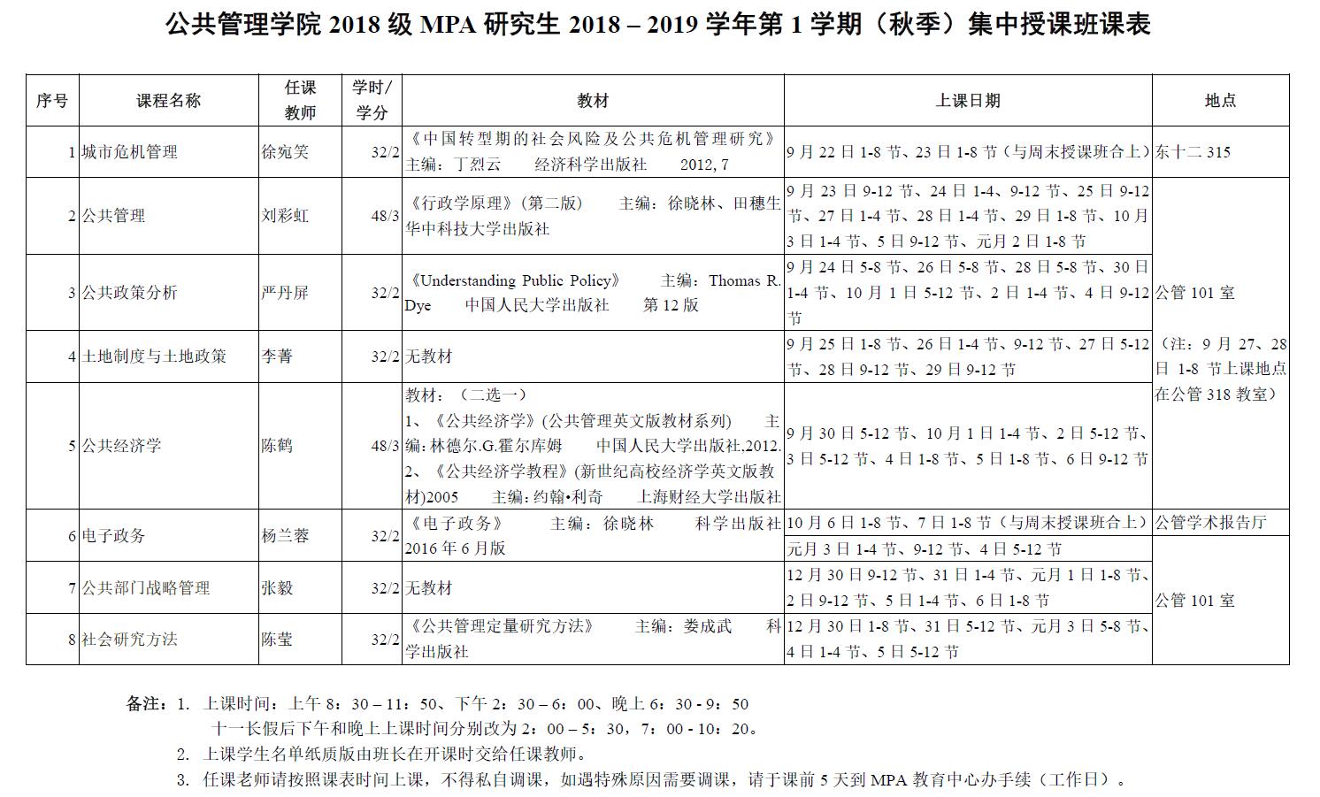 公共管理学院2018级MPA研究生2018-2019学年第1学期(秋季)集中授课班课表