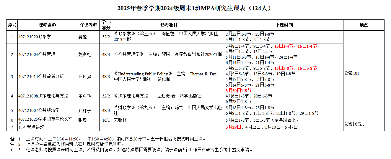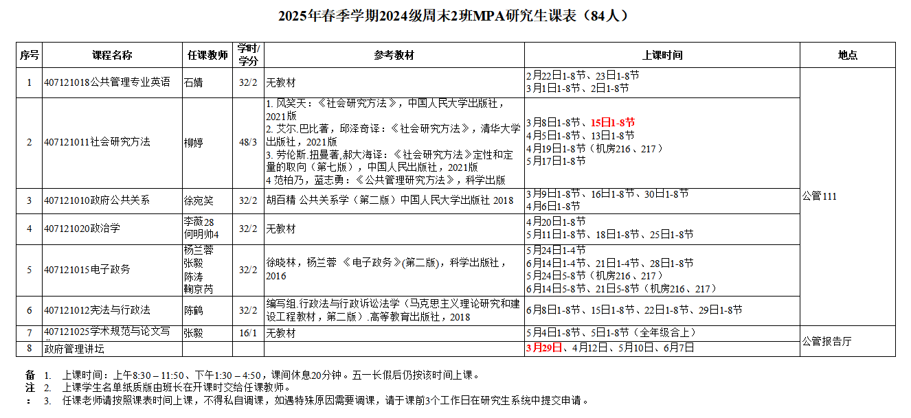 公共管理学院MPA研究生2025年春季课表